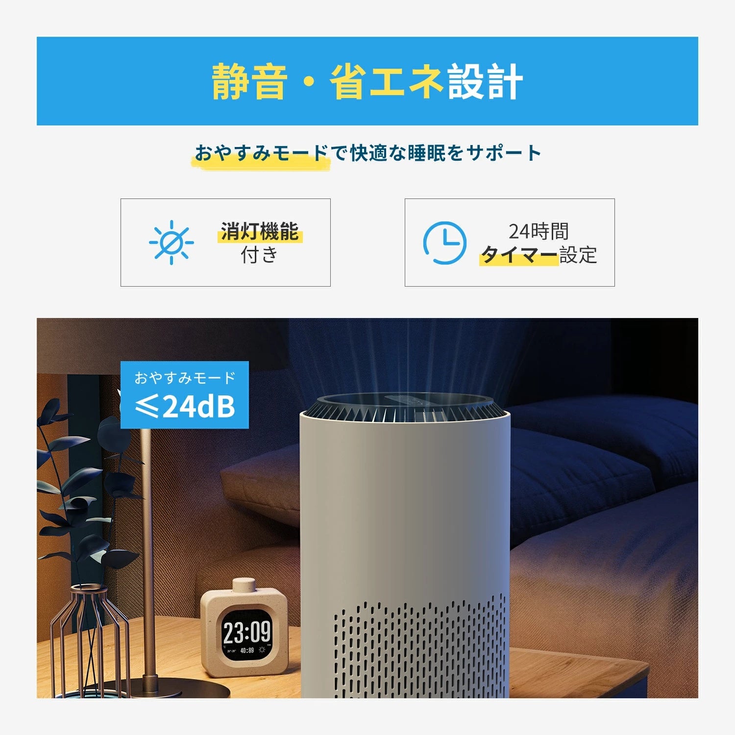 熟睡になるくらい静運転音で気になりません。快眠できるおやすみモードで一日中のストレス解消に役立ちます。フィルター交換操作のお手入れが簡単になります。